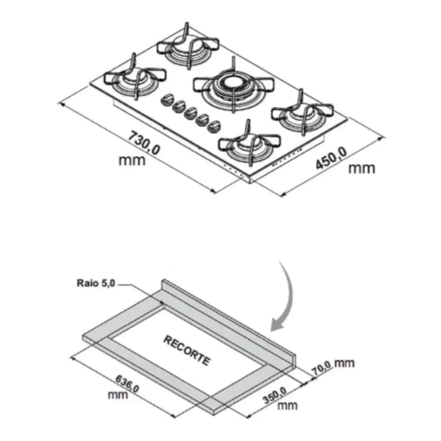 Para instalar o Cooktop Itatiaia Essencial 5 Bocas, as medidas recomendadas para o nicho são: