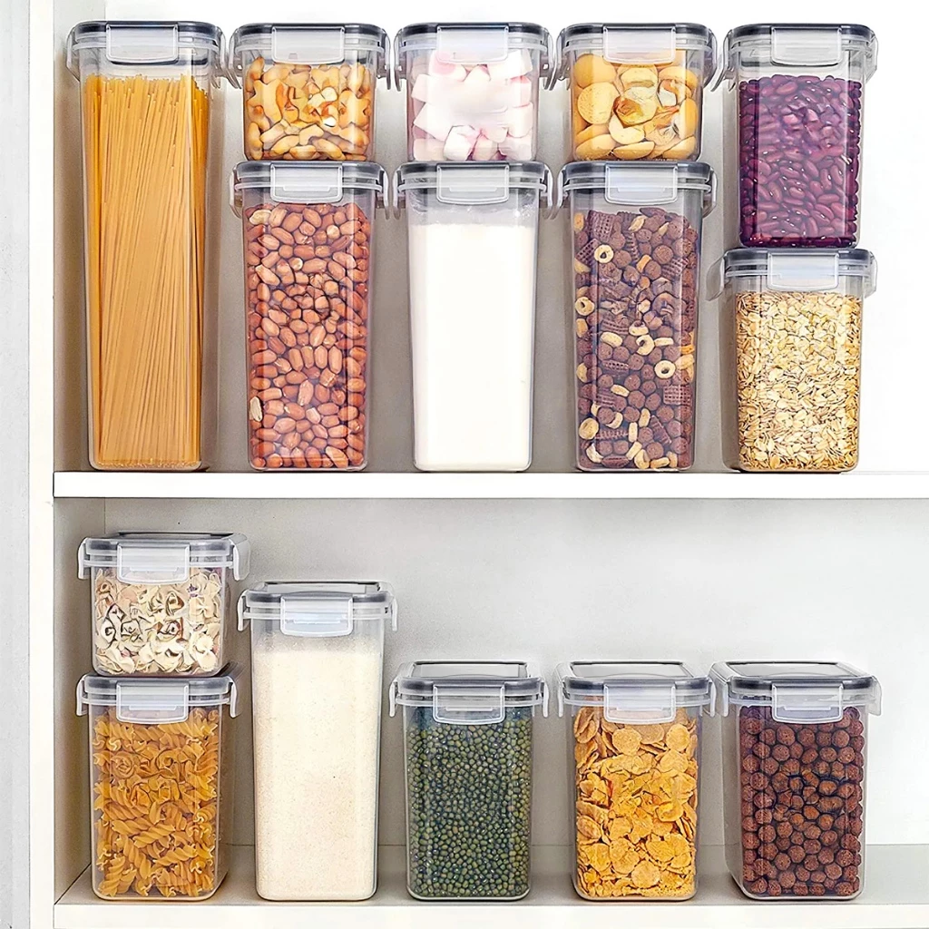 4 combinações de tamanho que atendem às suas necessidades. Nosso conjunto de recipientes de armazenamento de cozinha contém 4 tamanhos diferentes. Inclui 1 recipiente alto (2,8 l), 4 recipientes grandes (2,0 l), 6 recipientes médios (1,4 l), 4 recipientes pequenos (0,8 l). Perfeitos para armazenar espaguete, utensílios de cozinha, cereal, farinha, açúcar, aveia, macarrão, arroz, café, chá, salgadinhos, nozes e outros produtos secos.